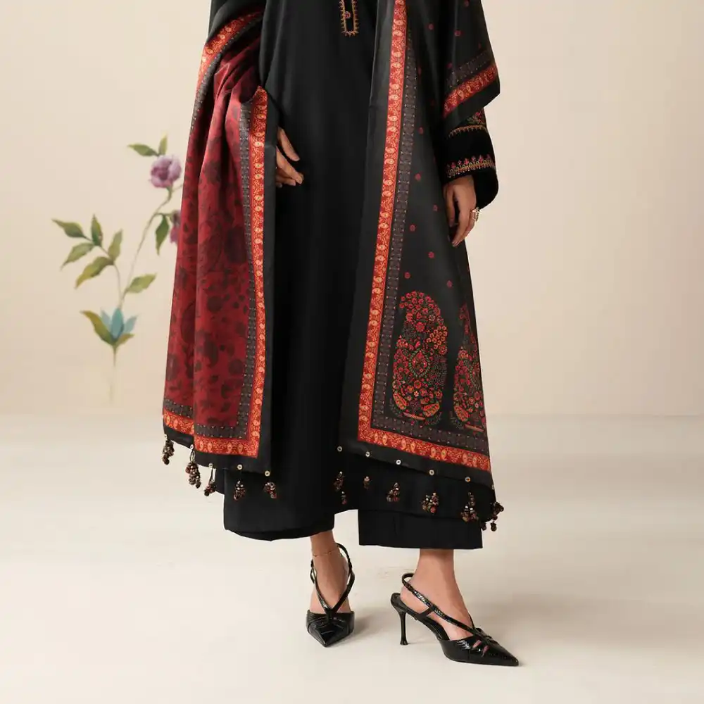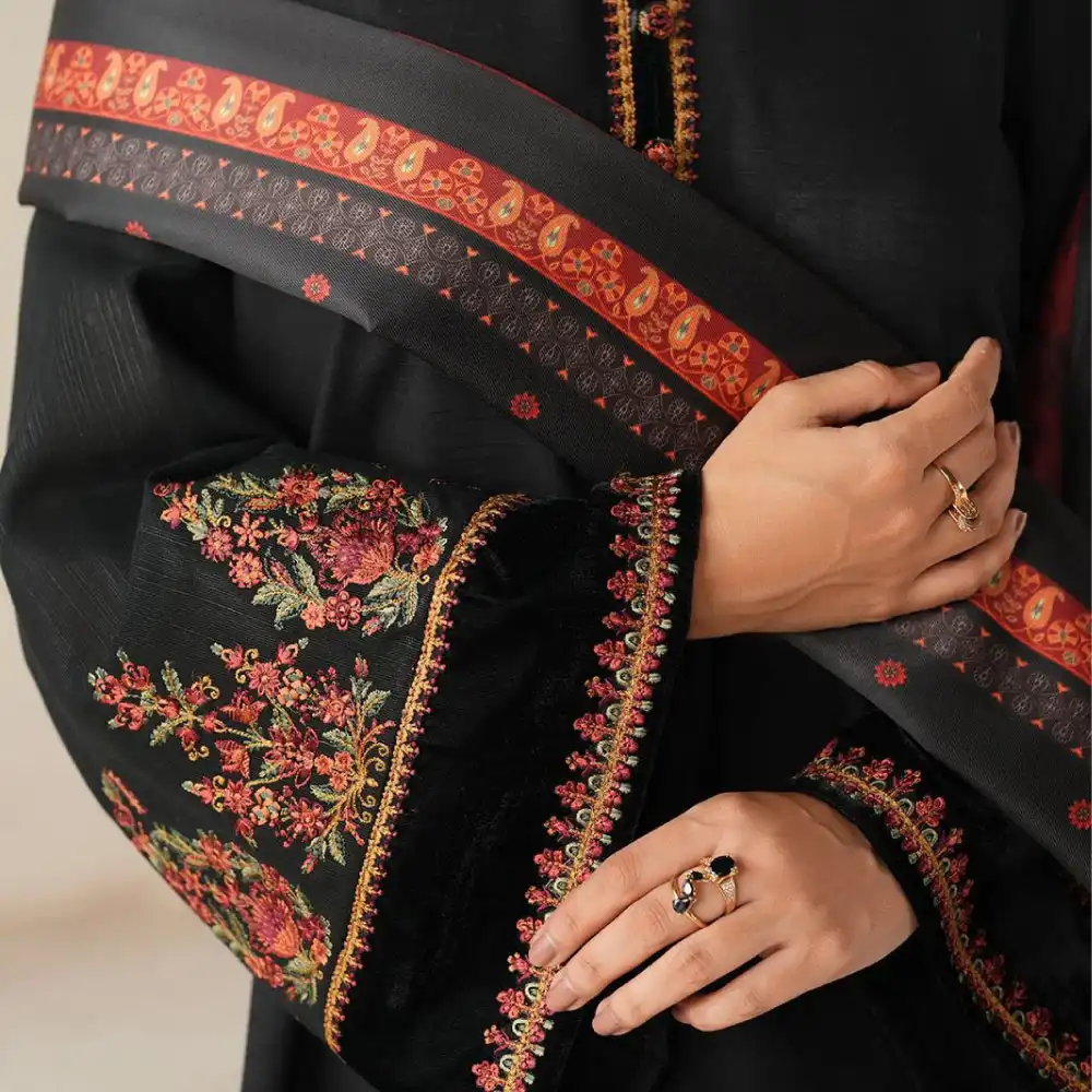 Elevate your festive wardrobe with Baroque’s Most Demanding Edition 3-piece unstitched suit. Crafted from premium Dhank fabric, this elegant ensemble features an embroidered neck patch, embroidered sleeves, and a beautifully digital-printed shawl for a refined, timeless look.